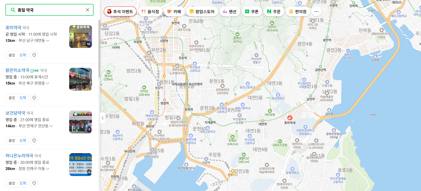 - 휴일지킴이 약국: 실시간 약국 운영 정보 제공
